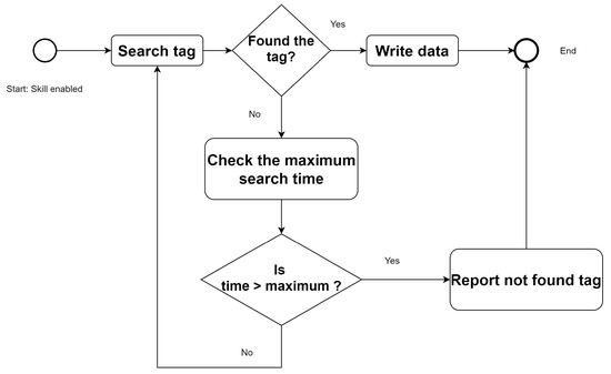 The use of RFID technology in mobile robotics is focused on localization and navigation [32,33,34,35]. A robot can read information from tags either to know its orientation concerning other elements [36,37] to know where it is [38,39], or with a set of tags to mark the path to follow.