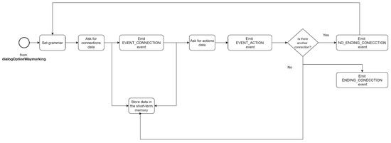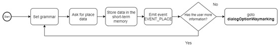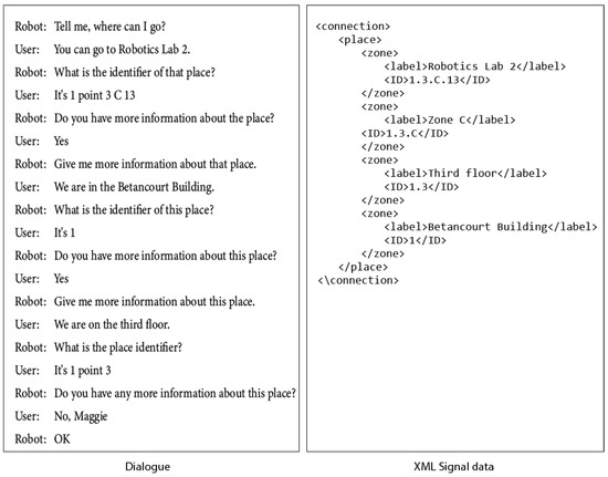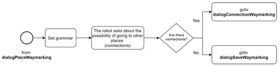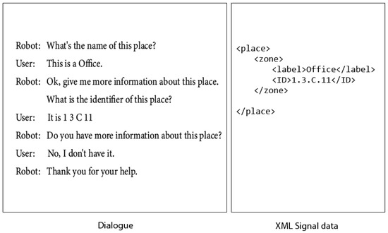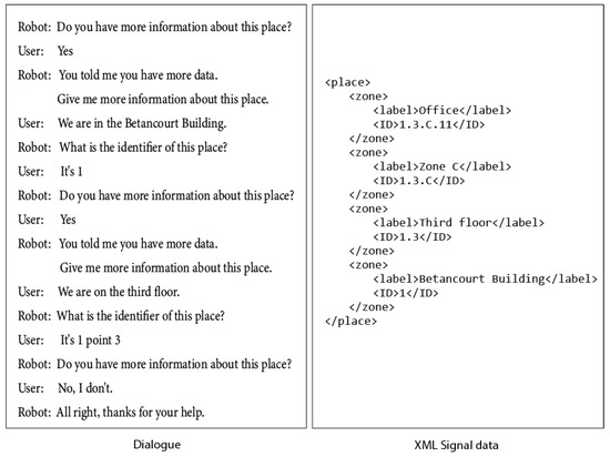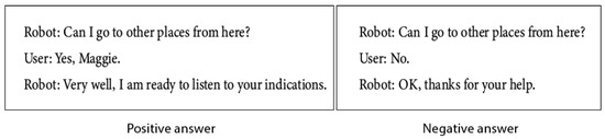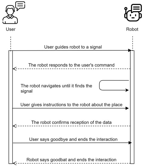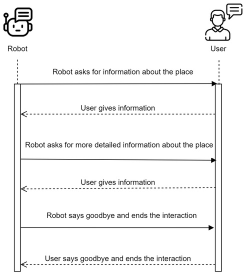 It is common for people to ask for information when we want to get to a place and we have no other elements to guide us towards the goal. In robotics, there are some works that use human–robot dialogues to give route instructions to a robot so that it can reach a destination [9,10,11,12,13]. Some researches use semantic and cognitive maps [14,15,16,17] and dialogues with basic directions [18,19] or include a SLAM algorithm for navigation and geometric localization [20]. However, in these semantic or topological maps, human–robot interaction does not play a key role in their building process.