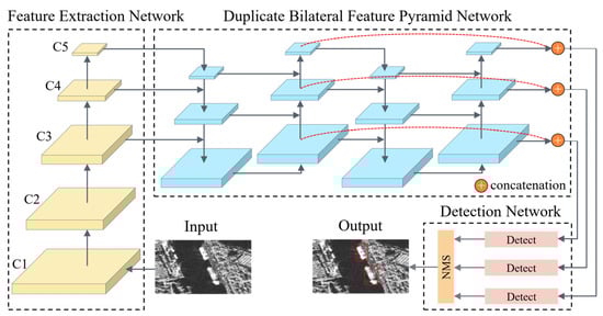 Overall architecture of the proposed method DB-YOLO. It consists of the Feature Extraction Network, Duplicate Bilateral Feature Pyramid Network and Detection Network.