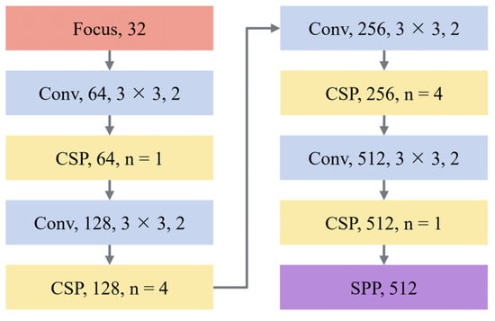 The flowchart of FEN is shown in Figure 2. Firstly, inspired by the backbone of YOLOv5, a Focus module is added at the front of the FEN to improve the feature extraction ability and reduce the loss of information during the down-sampling process. Secondly, a convolution layer with the kernel of 3 × 3 and the step size of 2 is used for down-sampling to concentrate information in channel space. After that, features were enhanced by the CSP block, and the above steps were repeated until the size of the feature map is 1/32 of the input image. Finally, the spatial pyramid pooling (SPP) [33] module at the end of the FEN was used to increase the receptive field to improve the scale invariance of the image.