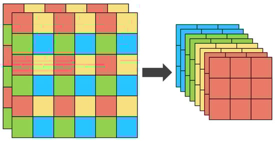 At the beginning of the network, the input picture is sliced through the Focus module, which splits every four adjacent pixels in a picture into four channels and concentrates the information in the channel space, thus expanding the input channel by four times. The Focus layer can avoid information loss in the process of image down-sampling and retain more complete information for subsequent feature extraction. The specific structure of the Focus module is shown in Figure 3.