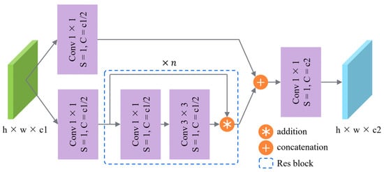 The CSP block is divided into two parts: CSP structure and Res block. The CSP structure firstly divides the input into two branches, respectively, passing through a 1 × 1 convolution layer while reducing the number of channels to half of the input, and one of the branches passes through the Res block. Then the two branches are merged by concatenation, and finally, the number of channels is modified to the set value through a 1 × 1 convolution layer. The Res block is the residual network, whose first layer is a 1 × 1 convolution layer, and the second layer is a 3 × 3 convolution layer. Then feature maps before and after the network are fused by the residual structure. The stride of the convolution layer in the Res block is 1, and the size and channel of the input and output feature map remain unchanged. Meanwhile, in order to avoid over-fitting and enhance the nonlinear learning ability of the model, batch normalization (BN) and the activation function are added after each convolution layer. The CSP block used in this paper is shown in Figure 4.