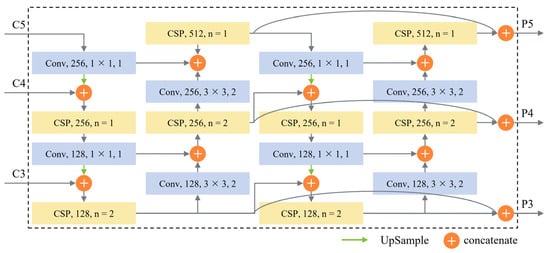 Inspired by PANet [26], the secondary fusion framework features of up-bottom and bottom-up are used in the feature fusion network in this paper. In the process of merging from top to bottom, the C5 layer in FEN first halves the number of channels through a 1 × 1 convolution layer and doubles the size of the feature map through up-sampling. Then concatenate it with the C4 layer in FEN, so the features are enhanced by the CSP block and the number of channels is halved to generate a feature map with the same size as the C4 layer. Then repeat the above process to generate a feature map of the same size as the C3 layer. In the process of bottom-up fusion, a convolution layer with the kernel of 3 × 3 and stride of 2 is used to adjust the size of the feature map, and then it is concatenated with the feature map of the same size in the up-bottom fusion process. After feature extraction by the CSP block, feature maps of the same size as the C4 layer are generated. Then repeat the above process to generate a feature map of the same size as the C5 layer. Similar to the FEN proposed above, the sensitivity of DB-FPN to small ships can be improved by increasing the number of Res blocks in the C3 and C4 layers.