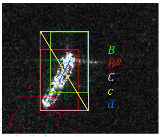 where represents the -th anchor of the -th cell containing the target. is the predicted bounding box, and is the ground-truth bounding box. C is the smallest box covering and , and c is the diagonal length of C. d is the distance of central points of two boxes. α is a positive trade-off parameter, and v measures the consistency of the aspect ratio. and (w and h) are the width and height of (B), respectively. The visualization of coordinate error of CIoU losses is shown in Figure 6.