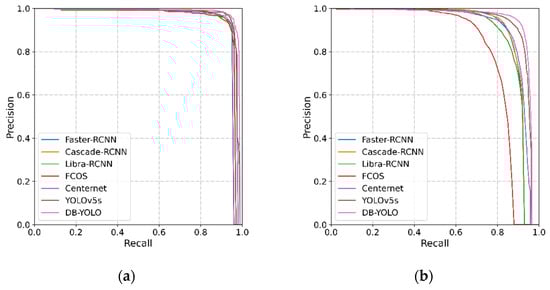 Figure 7 shows the precision–recall curves of different methods on SSDD and HRSID. The precision and recall were calculated at IoU = 0.5. The precision–recall curves on the two data sets both showed that DB-YOLO had higher accuracy than the other six methods.