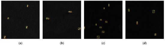 The images in HRSID are from Sentinel-1 and TerraSAR-X, including three single optimal resolutions of 0.5, 1, and 3 m. HRSID has a total of 5604 images (including 16,965 labeled ships) with the size of 800 × 800 pixels. Compared with SSDD, the HRSID image set owns higher resolution and richer ship characteristic information. In the experiments, HRSID used the same scheme as SSDD to generate training, verifying and testing sets.