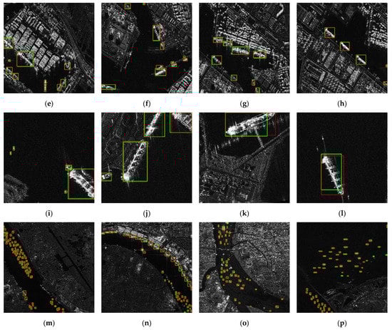 Ship detected results of DB-YOLO in HRSID. Red boxes indicate ground truth, and green boxes indicate detected ships. (a–d), (e–h), (i–l) and (m–p) in the figure showed the detection results of offshore ships, inshore ships, large-scale ships and densely distributed small-scale ships, respectively.