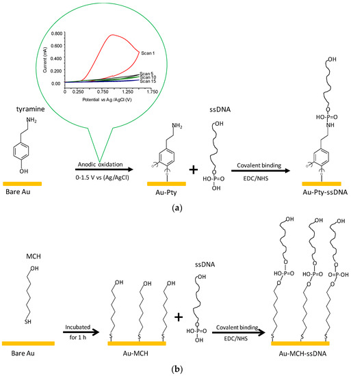 Pty- and MCH-modified sensor chips were placed on a Petri dish. Then, 10 µL of a solution of 10 µM capture probe in 10 mM potassium phosphate buffer (PB), pH 7.2, containing 5 mM EDC and 8 mM NHS, was dropped on each sensor chip surface [23]. The sensor chips were then left at room temperature for 2 h.