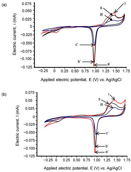 (a) Represents the reduction and oxidation peaks for: bare sensor chip, a′ and I; MCH-modified sensor chip, b′ and II; and Pty-modified sensor chip, c′ and III, respectively. (b) represents the reduction and oxidation peaks for: bare sensor chip, a′ and I; MCH-ssDNA-modified sensor chip, b′ and II; and Pty-ssDNA-modified sensor chip, c′ and III, respectively. The potential was swept in the range between −0.3 and 1.7 V (vs. Ag/ AgCl) in 100 mM H2SO4, at a sweep rate of 100 mVs−1.
