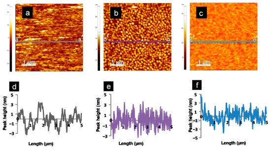 The 5 µm × 5 µm AFM images tapped in contact mode: (a) bare, (b) Pty-film-modified, and (c) MCH-SAM-modified gold sensor chips. The peak height profiles along the lines for (a–c) are shown in the figures marked (d–f), respectively.
