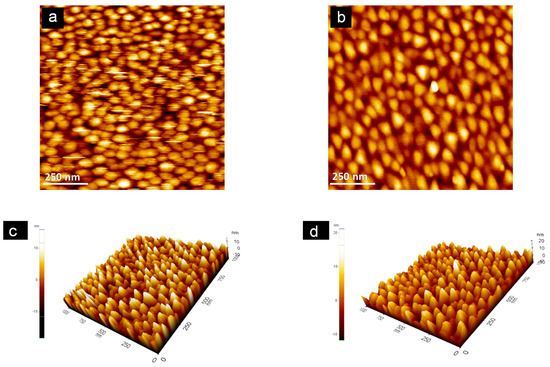 Non-contact mode AFM images (scan size 1 µm × 1 µm) of (a) gold sensor chip surface after being modified with Pty and coupled with ssDNA, and (b) gold sensor chip surface after being modified with MCH and coupled with ssDNA. The three-dimensional (3D) images of (a,b) are shown in the figures marked (c,d), respectively.