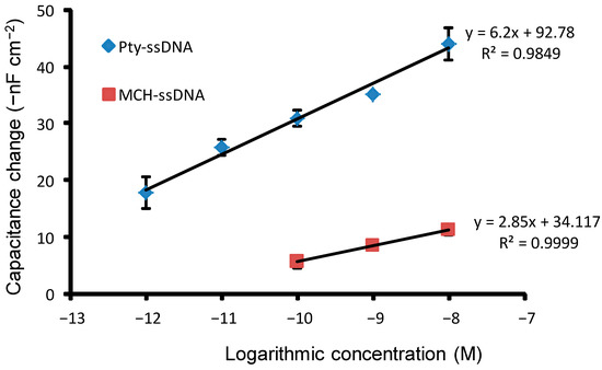 The calibration curves of the capacitive DNA sensor for Pty-ssDNA- and MCH-ssDNA modified sensor chips in response to the concentration of target complementary ssDNA are depicted in Figure 6.