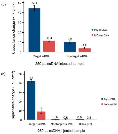For 15 cycles, the binding capacity of Pty-ssDNA and MCH-ssDNA retained about 90% of the original capacitance change. Hence, both types of sensor chips can be re-used with good reproducibility more than 15 times, with relative standard deviation (% RSD) of 6%, and 7%, respectively. The low % RSD values suggest the high surface stability of the strongly electrodeposited Pty film and chemisorpted MCH-SAM on the sensor chip surfaces [32,36]. Similar results regarding reusability capacity, of about 12 to 20 times, for a Pty-ssDNA-modified sensor chip in capacitive biosensor measurements were previously recorded [6,37].