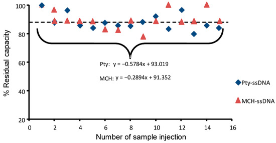 High surface stability provides accuracy and precision, and thus allows repeated analysis on the same surface. Figure 8 shows the percentage residual capacity of the Pty-ssDNA and MCH-ssDNA sensors compared to the number of injections.