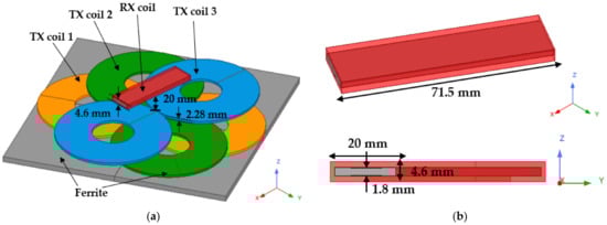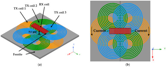 Design of the proposed models for WTT and WPT. (a) Perspective view; (b) Top view. Three TX coils are stacked at intervals of 60 degrees. RX coil is wound in the form of a solenoid.