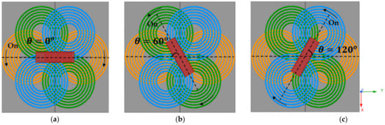 The fundamental principle of the proposed WTT method is the alignment of ferrites through the guiding of magnetic field. In order to transmit torque to the RX coil of the designed model, the surrounding magnetic field must be generated in the desired direction. At this time, the magnetic field is generated by the current flowing in the coil, and in particular, the magnetic field generated by the current flowing in TX coils which are larger than RX coil, is dominant. Specifically, it generates torque by using the property of magnetic materials to be aligned to minimize magnetic potential energy under a magnetic field []. Therefore, when power is applied to a desired TX coil according to the position of the RX coil, the ferrite of the receiver rotates in the center direction of the turned-on TX coil.