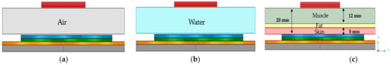 Simulation setup according to gap material. (a) Air; (b) Water; (c) Tissue made up of muscle, fat, and skin.