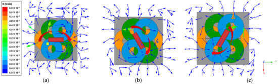 Simulation result of magnetic field vector direction and RX coil position according to TX coil on/off. (a) Magnetic field direction when TX coil 1 is on; (b) Magnetic field direction when TX coil 2 is on; (c) Magnetic field direction when TX coil 3 is on.