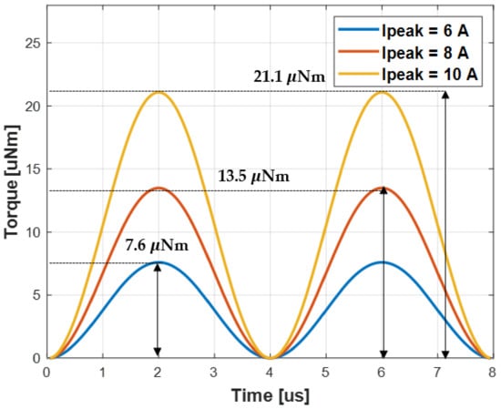 In addition, in Equation (17), the torque is proportional to the square of the current, which is verified through simulation. Figure 9 shows that when the RX coil is aligned with the TX coil 1, the torque is simulated while changing the current flowing through the TX coil 2, and it can be confirmed that the torque proportional to the square of the current increase occurs. At this time, the current flowing through the TX coil is determined by the input DC voltage as shown in Equation (18).