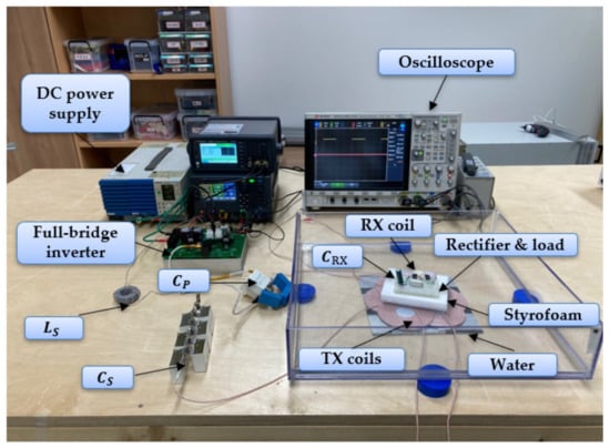 Both the WPT and WTT experiments use the same system and use a DC power supply and inverter to transmit power to the TX coil and connect additional inductors and compensation capacitors for the circuit implementation suggested in Figure 4. Table 6 shows the inductors and capacitors used in the experiment. An oscilloscope is used to find the DC to DC efficiency by checking the current flowing through the TX and RX coils and measuring the voltage and current flowing through the load.