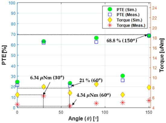 As a result of testing the proposed method, both DC to DC efficiency and torque for verifying WPT showed similar result to simulation result in Figure 11. First, the power transfer efficiency is at least 21% at 60 degrees, when TX coil3 is turned-on, and maximum 68.8% at 150 degrees, when TX coil1 is turned-on, similar to the simulation result. When the coupling coefficient with the TX coil is relatively low at 0 degrees, 60 degrees, or 120 degrees, the efficiency is low, and the efficiency increases as it approaches to the turned-on TX coil. In the experiment, between TX coil 2 and RX coil when is 0 degrees, between TX coil 2 and RX coil when is 30 degrees, between TX coil 3 and RX coil when is 60 degrees, between TX coil 3 and RX coil when is 90 degrees, between TX coil 1 and RX coil when is 120 degrees and between TX coil 1 and RX coil when is 150 degrees measure the efficiency and torque at each case.