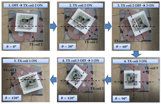 When the proposed model is viewed from the top, when the next TX coil is turned on sequentially, the magnetic field direction rotates clockwise, which can be expressed using the rotation matrix.