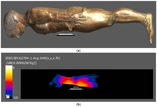 To obtain the SAR, the induced electric field generated in the proposed WPT system was analyzed using Ella among the anatomical models of Information Technologies in Society (IT’IS). The simulation was carried out in the case of matching with TX coil3 among the positions of the RX coil, and the maximum received power was 26.5 W. As shown in Figure 13, the insertion position of the receiver is subcutaneously under the abdomen, and the transmitter is 20 mm away from the receiver.