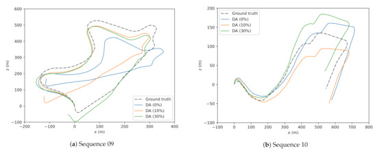 The predicted trajectories of the best model DA (30%), second-best DA (10%) are plotted against the ground truth in Figure 2. The overall estimated trajectory trained with DA 30 percent performed well on ATE and translational error . This study considers ATE as one of the significant evaluation metrics in the aspects of VO tasks to reduce the drift and is often underemphasized.