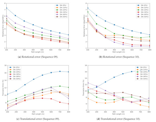 From the experiments, it is evident that increasing the dataset by augmenting does not always result in higher accuracies, especially in a complex multi-view geometry problem, such as VO. The best model for comparison with other related works is chosen to be the dataset with DA (30%). Though the dataset with DA (10%) performed superior to other splits in terms of translational error, the dataset with DA (30%) outperformed it over the other two evaluation metrics. Rotational and translation errors of models trained on different augmentation split and tested on sequences 09, 10 for subsamples are shown in Figure 3. From Figure 3c,d, it can be observed that the model trained on DA with 30 percent is stable and accurate compared to other splits. Similarly, from Figure 3a,b, DA (30%) performed superior to other splits. Though DA (30%) is lagging behind DA (10%) in a singular case (translational error ), overall performance of DA (30%) is better compared to others, and this model is used to compare with the related works in the next section.