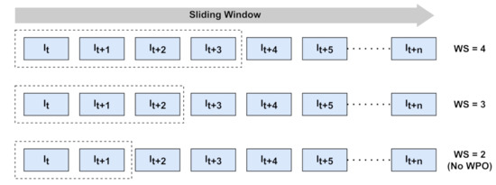 This section includes the experimentation on the proposed WPO-Net to examine the efficiency of learning-based windowed pose optimization. The conclusion is drawn by training and testing the network with three different window sizes . The defines the number of consecutive images used for every single backpropagation. Let be equal to n images, and the number of times the network is forward propagated is given by with a single backpropagation. When , the network by default acts as a standard supervised network with one sample input and one sample output. The three different window sizes are selected to observe the efficiency of windowed pose optimization by examining the evaluation metrics. Figure 4 illustrates the number of images used for a single iteration as the windows slide towards the right.