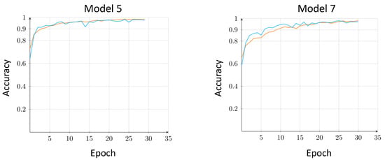 Comparison of the accuracy track between Model 5 and Model 7 in Experiment 1. Orange and blue lines represent the training and validation phase, respectively.