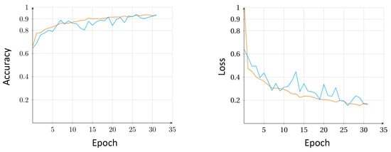 The accuracy and loss graphs of model Model 5 in Experiment 3. Orange and blue lines represent the training and validation phase, respectively.