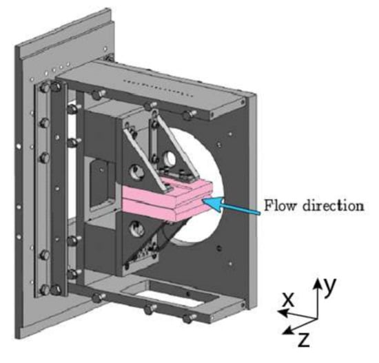 The experimental arrangement was designed in order to maintain a constant refractive index along the -axis, i.e., the optical axis. Two parallel walls made of stainless steel constitute the flow channel. The test section has optical windows on the walls, allowing the passage of light beams for optical measurements. The channel height (along the -axis) was set to . The channel is long (-axis) and the width (-axis) of the channel is to achieve a sufficient aspect ratio to eliminate secondary flow effects and to provide the sufficiently long optical path necessary for the adequate sensitivity of the interferometry. In order to obtain quantitative values of measurements, the ambient atmospheric pressure () as well as the outlet static pressure in the settling chamber of the wind tunnel () were measured.