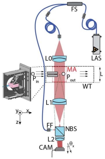 The experimental setup, consisting of the narrow channel experimental section and a Mach–Zehnder interferometer, is illustrated in Figure 3. A laser beam was generated by a pigtailed single-frequency distributed feedback laser (LAS) of wavelength and fiber output power of . The laser beam was split using a fibersplitter (FS) into the reference wave and the object wave. The reference wave was guided by an optical fiber to the non-polarizing beamsplitter (NBS), while the free-space object wave passed through a collimating imaging lens L0, which sent light through the measuring area (MA) within the wind tunnel (WT), before it passed through the lens L1. Lenses L1 and L2 acted as a beam expander with magnification of as well as an imaging system. Both reference and object waves were recombined by the NBS and collimated by L2. The object wave impinged the digital camera sensor (CAM) normally, while the reference wave angles were respectively. The angles of the reference wave were adjusted by a slight translation of the reference beam’s fiber ferrule (FF).