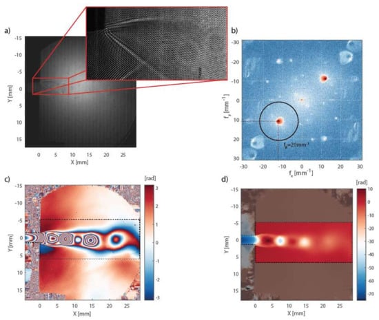 created on a charge-coupled device (CCD), or a complementary metal-oxide semiconductor (CMOS) chip, by the superposition of a reference and an object beam. In (7), is the additive component and is the multiplicative component. The interference phase is coded in a cosine modulate fringe pattern. There are several ways to retrieve the interference phase []; however, for the characterization of fluid flow in wind tunnels, where real-time and high-resolution measurements are required, most of the interferogram processing techniques fail. An option to tackle the issues is spatial carrier interferometry [], which introduces small angles of incidence , in the , directions on the camera sensor in the reference beam. This results in further modulation of the interference pattern with cosine fringes pattern of constant spatial frequencies and , respectively. Let us rewrite (7) using a complex exponential including the carrier frequencies and :