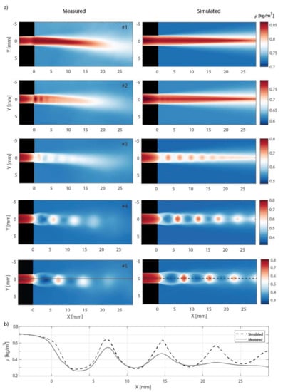 (a) Density distributions for different regimes—comparison of measured data (left) and the CFD simulations (right); (b) density values along the profile denoted in (a) for regime #5.