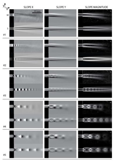The measured distributions in Figure 5 have significantly dynamic ranges of values. Therefore, some faint details of the flow might be difficult to observe. In order to visualize the high-frequency spatial variations in the flow, the slopes of the measured density distribution in the horizontal and vertical directions , were calculated, and these, together with the magnitude of the slope , are shown in Figure 6. Such results could be directly compared to the Schlieren imaging techniques, which are sensitive to the ray deflections caused by refractive index gradients and , respectively.