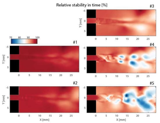 for each pixel of coordinates can also be computed from the data set. The standard deviation can be used to calculate a time stability map that (assuming the normal probability distribution) equals one in pixels of completely stable flow, while it approaches zero at locations of random signal. The time stability maps of flow in different flow regimes are shown in Figure 7. It is clear that in the narrow channel, the flow is very stable, but becomes much less stable in shear layers and regions of flow dissipation. This effect is more apparent at high flow velocities with a more turbulent character.