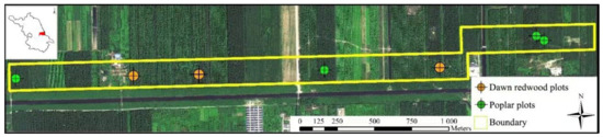 2 area were designed and surveyed; these included three sample plots with dawn redwood and four plots with poplar. These plots’ stand densities were low, medium, and high. One additional sample plot of medium-density poplar was set up as a backup. The coordinates of the centers and corners of the plots were measured with differential GPS in each sample site.