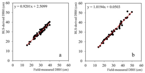 F of poplar = 0.92). When a clustering algorithm based on point cloud density was used for individual tree segmentation, it was necessary to reasonably set the threshold of point density. If the threshold was too large, part of the trunk would not be recognized. If the threshold was too low, the phenomenon of tree trunk misclassification would occur, and many irrigated grasses with a height of 1.3 m would be mistakenly classified as trunks. As a result, it was necessary to adjust the threshold in the trunk segmentation process on a regular basis to achieve a better segmentation effect. In this study, the BLS collection route was “S”-shaped, and the planting rules (e.g., same space, etc.) were regular. The design of this route could completely cover the trunks of all of the trees standing in the sample plot, resulting in a more complete trunk point cloud and more accurate DBH data.