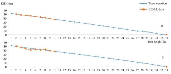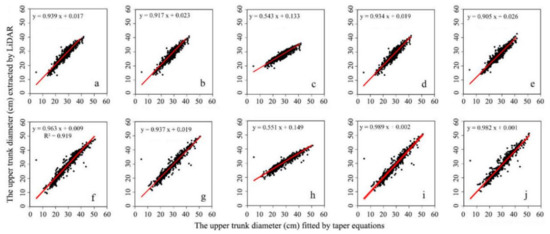 The following five alternative taper equations were used for fitting using the LiDAR-derived structural parameters, such as tree height, DBH, and upper trunk diameter, and finally, the group with the highest accuracy was selected as the taper equation model.
