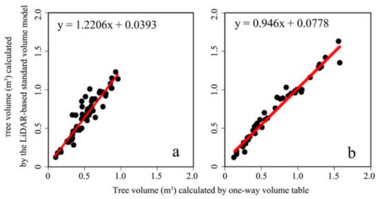 4]. As the forestry sector standard in China, the local volume table (i.e., one-way volume table), which allows the estimation of the stem volume from the diameter at breast height (DBH), originated in the 1970s. However, due to changes in climate, site and forest resource structures in China, some volume tables from that year inevitably contain errors in the actual use process, which has a significant impact on the results of evaluating the volumes of plantations. Therefore, it is an urgent problem to redevelop the standard volume model with a high precision and a strong applicability and to compile a standard volume table (i.e., two-way volume table, requiring both DBH and tree height) for the precision of cultivation of planted forests depending on the different requirements for forestry production and forest cultivation in different areas. The forest volume is an important parameter for assessing forest health, as well as a crucial foundation for national and forestry workers when assessing the state of a forest and formulating cultivation strategies. Although volume tables have brought new opportunities to provide feasible and detailed volume estimations, using conventional field measurements to construct forest volume tables is still a challenging task that is labor-intensive, time-consuming, costly, destructive, and spatially limited [