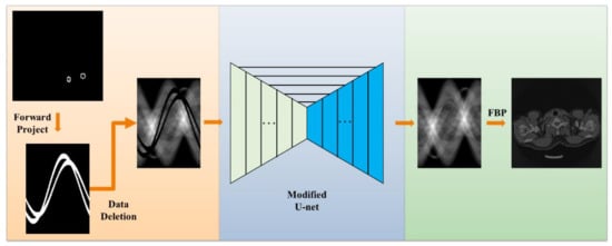 The workflow of our method is illustrated in Figure 1. First, training data and simulation were generated, followed by the removal of metal-damaged projection data. We used sinogram data in a scene that did not contain metal objects and then created a matching sinogram by deleting data corresponding to the geometric configuration of that metal object; next, the network was designed and trained, that is, U-net based sinogram completion. We modified the original U-net to improve the data filling performance and the generalization ability of the model; lastly, FBP images were reconstructed efficiently.