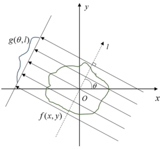 Helgason–Ludwig consistency conditions (HLCCs) are widely used in CT image artifact correction and sinogram data recovery [36]. A parallel beam of X-rays at a specific angle is selected for the theoretical derivation of HLCC, as shown in Figure 4, where is the projection angle of the parallel X-rays, represents the scanned object in a two-dimensional space, and its projection under is . The k-order momentum of is defined as