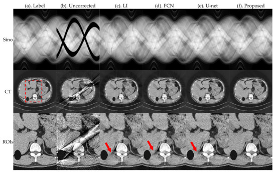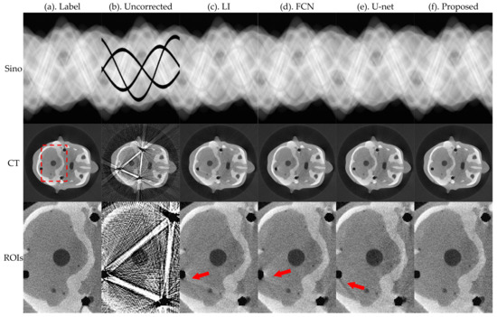 To accurately evaluate the artifact correction effect of each network, NMAD and RMSE were calculated for the obtained reconstructed images and the selected ROIs using Equations (10) and (11), respectively. NMAD and RMSE values in Table 4 show that in the actual experimental results, i.e., the reconstruction results obtained by applying the proposed method, the MAR effect was the best. In the results of projection image processing without metal placement, the NMAD index of the reconstructed image decreased by 50.286%, 36.029%, and 33.672%; the RMSE index value decreased by 48.214%, 38.536%, and 35.163%; the NMAD index of the ROIs decreased by 50.362%, 46.128%, and 39.241%; the RMSE index value decreased by 43.443%, 44.162%, and 34.906%, relative to LI, FCN, and U-net, respectively. In the results of projection image processing with metal placed, the NMAD index of the reconstructed image decreased by 42.331%, 42.739%, and 35.931%; the RMSE index value decreased by 37.850%, 32.997%, and 33.166%; the NMAD index of the ROIs decreased by 39.692%, 42.551%, and 37.083%; the RMSE index value decreased by 40.797%, 39.381%, and 36.053%, respectively, compared with LI, FCN, and U-net.