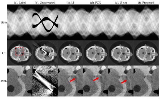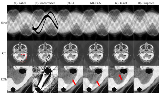 Figure 5 and Figure 6 present the pleural and cranial results, respectively, obtained using the four algorithms. The first column shows the ground truth of the sinogram and the corresponding standard FBP-reconstructed results. We also show the results of the conventional LI model, deep-learning-based FCN, and U-net. Severe streak artifacts are observed in the CT images obtained by directly performing FBP reconstruction on the uncorrected sinogram in Figure 5 and Figure 6. Columns (c)–(f) in the second row show that different methods have different suppression effects on metal artifacts. The region of interests (ROI) marked by the red dashed box in the reconstructed image is enlarged in the third row. The enlarged ROIs show that our method reduces the global radial streak artifacts and generates images with more explicit boundaries and details.