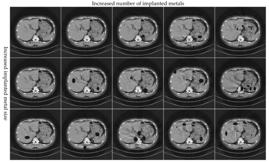 Simulation results of the pleural with different numbers, shapes, and sizes of metal implants. The display window of CT is (−0.1, 0.25).