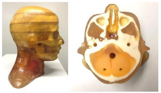 To verify the application effect of this method for a realistic CT system, we performed a radiological anthropomorphic head phantom study for actual applications. The phantom is shown in Figure 8. The actual scanned CT system consisted of a micro-focus spot X-ray source (Hawkeye130, Thales, France), a flat-panel detector (Varian 4030E, USA), and a high-precision 4-axis linkage stage. To verify the adaptability of this network, we obtained the sinograms for different values of voltage and current. The X-ray tube voltage range was set to 90–120 kVp, and the current was set to 200–300 μA. We collected 31,000 pairs of sinogram images, of which, 30,000 were used for network training and 1000 for testing.