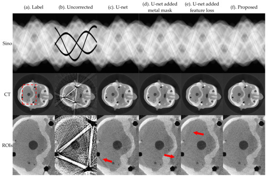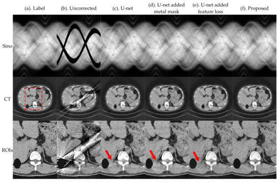 In this section, we evaluate the effectiveness of the proposed method for metal traces masking and sinogram feature losses. Performance was evaluated based on the relevant results of the ablation experiment. Figure 11 and Figure 12 present the results of U-net, U-net-added metal mask, U-net-added feature loss, and the proposed method, for the pleural and the phantom head, respectively.