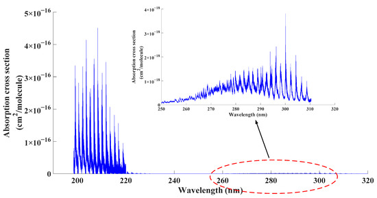 In order to select a proper excitation for the detection system, the absorption characteristic of SO2 was studied first in this paper. Based on current studies, it was recognized that two major absorption bands of SO2 exist in UV band. According to the principle of absorption spectroscopy, the nominal wavelength of the excitation falling into the absorption band of investigated gas contributes to better performance of the detection system. Given the data provided by Gordon [21] and Blackie [22], the absorption cross section of SO2 in the UV band can be depicted as follows.